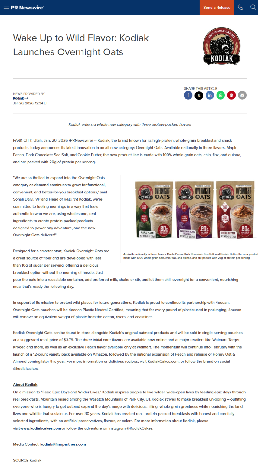 “We are so thrilled to expand into the Overnight Oats category as demand continues to grow for functional, convenient, and better-for-you breakfast options,” said Sonali Dalvi, VP and Head of R&D. “At Kodiak, we’re committed to fueling mornings in a way that feels authentic to who we are, using wholesome, real ingredients to create protein-packed products designed to power any adventure, and the new Overnight Oats delivers!”